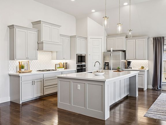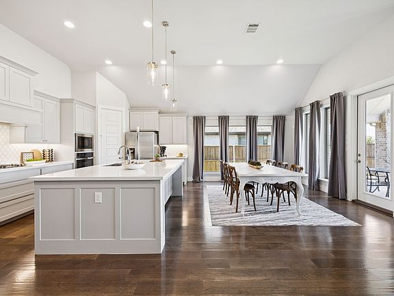 The gourmet kitchen will impress even the pickiest chef — featuring quartz countertops, an oversized island, tons of cabinets, a generous corner pantry, and a dining area overlooking the backyard.