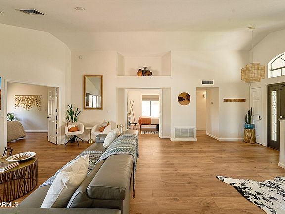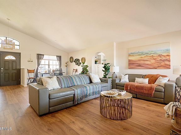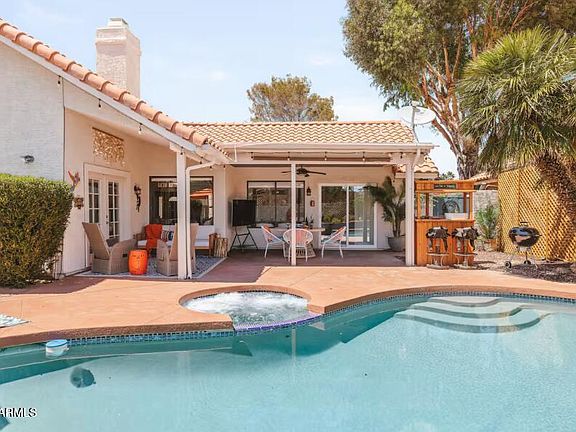 include upgraded fixtures & hardware, fresh interior paint 2025, upgraded bathrooms, a newer A/C system, & updated flooring 2023. All appliances & potentially all furnishings included. Step outside to your north/south-facing backyard—perfect for entertaining—with an extended covered patio, heated pool & spa.