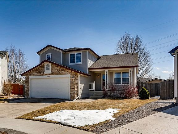 Enjoy sitting on the covered composite deck with a view of the open space and large private back yard. Often deer will meander by and nestle in. The front porch has room to sit and take in an unobstructed view for miles. The upper level has 3 bedrooms a Jack and Jill bath, large master bedroom with an amazing view of the open space, and master bath and walk-in closet. There is a great room with lots of windows and a study with french doors. The spacious kitchen has a sit at island plus a roomy eating space. The see-thru fireplace can be enjoyed from the kitchen as well as the great room. The powder bath is conveniently located just inside the door leading to the 2 car garage with workbench. The finished basement can be used as a 4th bedroom or perfect man cave with bar area, small refrigerator and 3/4 bath. Stay cool this summer with the newer central AC unit. This home sits on a cul-de-sac and is nicely located for quick access to downtown Parkers restaurants and entertainment.