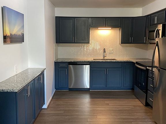 Contemporary finishesCozy carpeted areasCustom navy-blue kitchenTop-of-the-line stainless steel appliancesSleek tiled backsplashAmple cabinetryBrand-new flooring