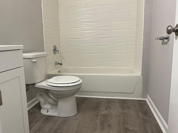 White quartz countertopsVinyl flooringStainless steel appliancesNew wood cabinetry