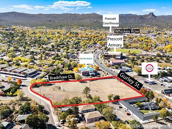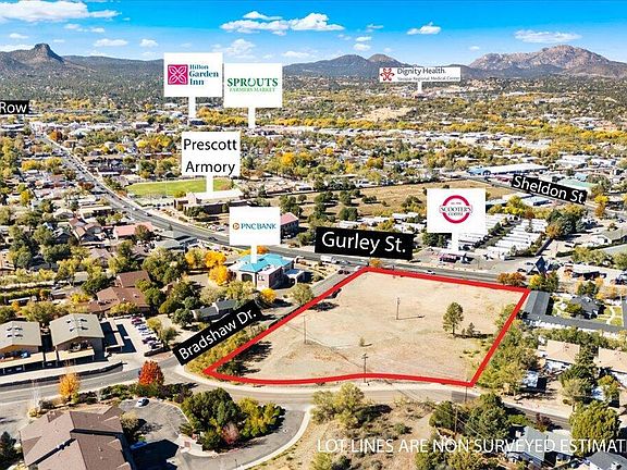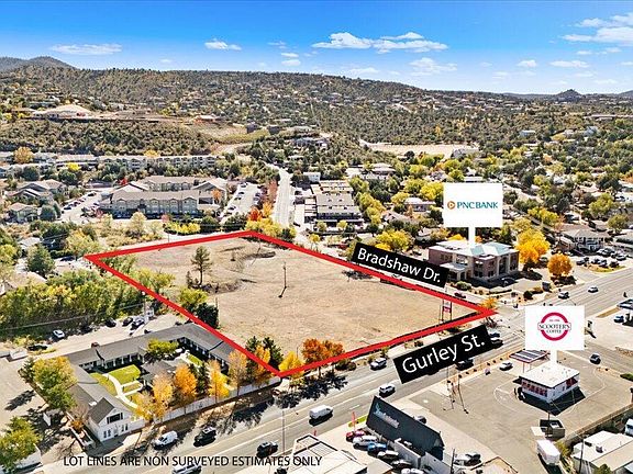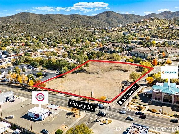 3.4 acres (148,104 sf) ready for development. Ideal for commercial with multifamily component. Located on the corner of Bradshaw and E Gurley which is a signalized intersection. Property has access from Gurley St, Bradshaw Dr and Stetson Rd. Three phase electric & sewer on the property, and all other utilities to the property. Leveled and ready for final development as determined by you and your client. Zoned BG allowing for a wide range of businesses including retail, professional offices, restaurants, and service providers like health services, financial services, etc. See City of Prescott for all specific uses permitted but generally this property allows for diverse commercial activities.
