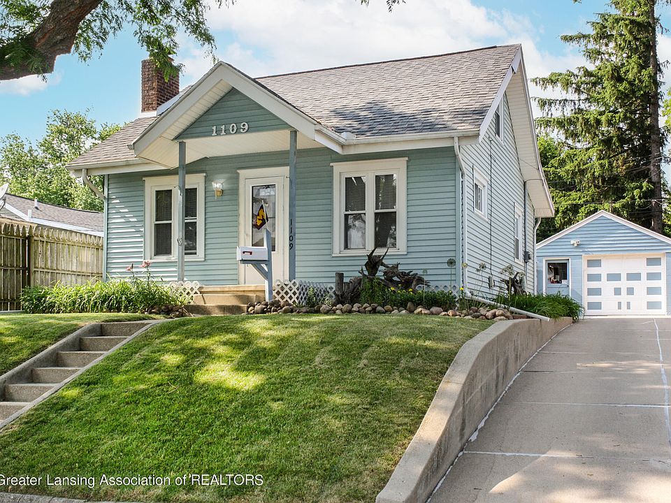 Pull up to this charming Bungalow on Lansing's Eastside and you will notice the care the owners have taken over the past 30+ years. Home is elevated nicely above street creating great privacy. Walk into the front door and the large living room greets you. This area could easily accommodate both living and dining rooms and features a wood burning fireplace. Continue to the the bedroom through the Archway leading the rear of the home. Bedroom is on the left side overlooking backyard. Bath is situated between bedroom and kitchen with cast iron tub and shower combo. Kitchen with newer oak cabinets, neutral counters and newer appliances and eating area has outside access to the fenced backyard & 1.5 car garage w/door opener. 2nd bed on 2nd floor. Basement houses washer/dryer. Immaculate!