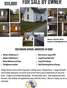 Single Family Home for sale by owner in Anderson, IN 46012. Single family home with living room, dining room, 3 bedrooms, 1 large full bath with master bedroom on lower level of the home and 2 bedrooms on the 2nd level. Large 2 car detached garage. Private back yard. Gas appliances and furnace, city utilities. All appliances stay with the home. Move in ready, as is no warranty.