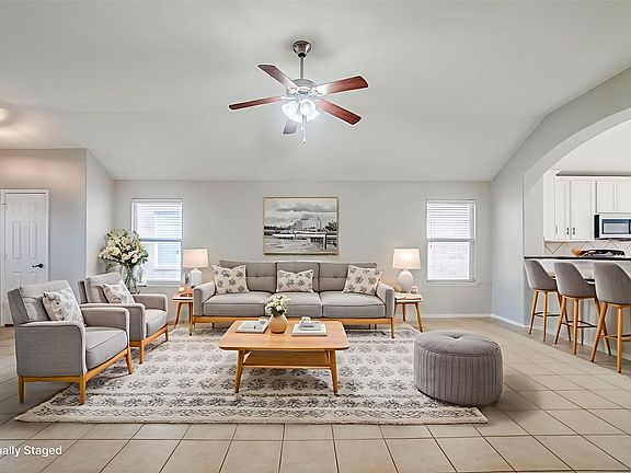 Beautiful single-story home featuring 3 bedrooms and 2 bathrooms with a 2-car garage. The open layout includes a stylish kitchen with a bar, island, and breakfast area, enhanced by accent lighting for a warm, inviting feel. The primary suite offers a spacious closet, double vanity, and a separate tub and shower. Enjoy outdoor living on the back porch overlooking the wood-fenced backyard. One or more photos have been virtually staged.