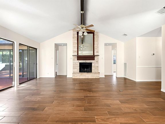 Spacious open-concept living area with high ceilings and a striking stone fireplace, seamlessly flowing out to a large backyard deck that offers serene views of a lush greenbelt and creek. The kitchen, complete with all appliances, also overlooks the deck perfect for entertaining. Each bedroom features its own private bathroom, providing comfort and privacy. A separate utility room includes washer, dryer, and additional storage space. Enjoy access to Lakeway amenities such as golf, tennis, swimming pools, parks, hiking trails, a marina with boat ramp, and even a private airport with fuel and parking.