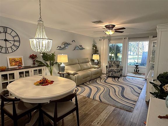 This lovely 2 bedroom, 2 bathroom Highland Lakes Villa, located in a 55+ community, has been completely updated! You will love the Mediterranean architecture and beautiful golf course view. Beginning in 2015, custom mahogany cabinets, quartz countertops, under counter lighting, refrigerator, stove, disposal and dishwasher were updates in the kitchen. The master ensuite has custom closets, vanity, and walk-in tile shower. Your guests will feel right at home in the guest bedroom with bath facilities right outside their door. The laundry closet is adjacent to the master bedroom and includes a new LG washing machine installed in 2025. Impact resistant windows were installed throughout and include the sliding glass doors to the Florida room. Luxury vinyl plank and tile floors, new wood doors, and crown molding were added. Electronic door lock and Ring security system were installed in 2023. Outside, the garage floor, driveway, walkway and entry were all surface coated in 2024. The garage ceiling was skim coated, electrical outlets added, and an access ladder to the attic and shelving were installed in 2024. A new air conditioner and hot water tank were installed in 2024. There is also a water softener. Beautiful entryway landscaping was added in 2025 as well as new impact resistant front door. The furniture is negotiable. The Golf View Villa I HOA is 265.00 monthly. This includes lawn care, irrigation, exterior painting, trash removal, cable TV and internet. The master HOA is $164.00 monthly, which includes green fees for the three golf courses, boat rides on the community pontoon boats, pool access, tennis and pickleball courts and many other clubhouse activities. There is a secure storage lot for your RV or boat, along with access to the boat ramp. Don't wait, come see this beautiful villa today!
