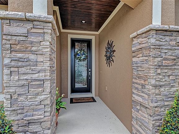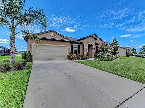Family space and fun for everyone is the only thing that matters with this terrific Pulte Dockside model pool home. Enhanced with crown molding, wall and chair molding, brand new wood floors and loads of extras. The open plan dining room, living room and kitchen give tremendous space for all your friends and family. The kitchen features beautiful back splash tile, hooded glass vent, huge walk-in pantry, and a one level counter-height granite bar for plenty of space for all those pitch-ins you're going to have with your friends. This home has 3 bedrooms, and a 10 x 10 office w/ closet as you enter the home. The Master Bedroom is very large; through the master bath you reach the room-size master bedroom closet for all your personal storage needs. The two guest bedrooms share a large hallway bath. What you won't be able to resist is the 36'x10' covered area in the lanai with room for a large table and chairs, a conversation seating area, and then the fabulous pool that has a southern view of the long lake. The pool has a water feature, a tanning shelf, and a place for your shady umbrella. Beautiful landscaping on extra large, lake front lot (75' width lot in front, 70" width lot in back.) The garage is a three (3) car tandem garage. NO CDD bond debt on this home. HOA is only $100/year. CDD Maintenance is $1,510 per year paid with taxes.