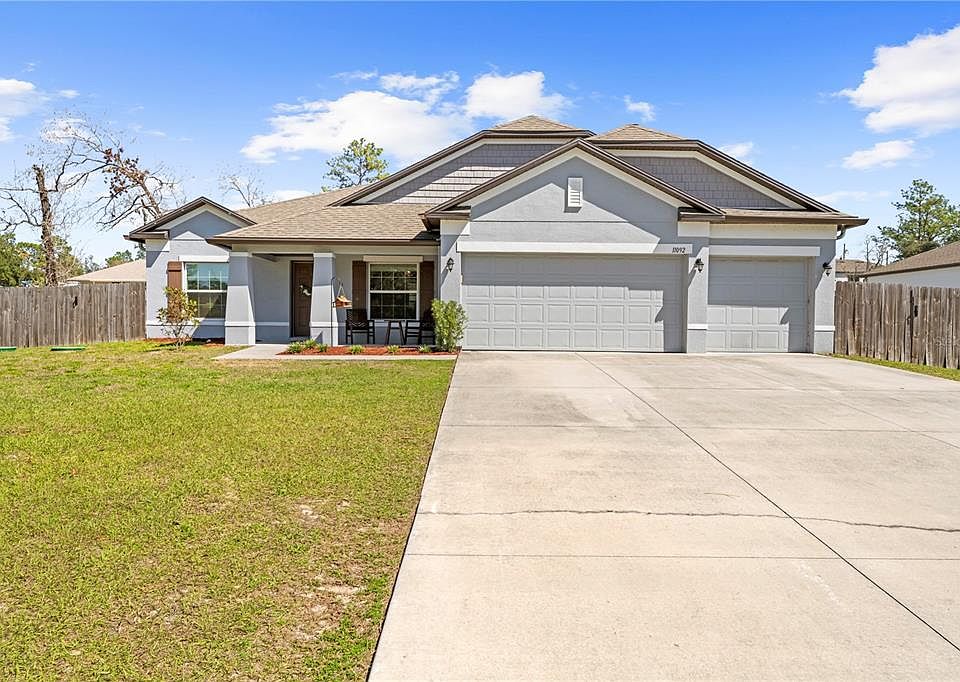 Modern 4-Bedroom Home in Weeki Wachee – Built in 2021! Welcome to this stunning 4-bedroom, 3-bathroom home, built in 2021 and nestled on a spacious half-acre lot in Weeki Wachee. With a well-designed split floor plan, this home features wood-look ceramic tile flooring throughout the main living areas, while the bedrooms offer cozy carpeting. Upon entry, you’ll find an office/den to the left, perfect for remote work or a quiet retreat. The separate dining room flows seamlessly into the open-concept main living space, making it ideal for entertaining. The kitchen is a chef’s dream, featuring stainless steel appliances, an eat-in kitchen bar, and plenty of counter space for meal prep. The master suite offers a private escape, complete with dual sinks, a walk-in shower, and a soaking tub. The screened lanai leads to a paver patio with a built-in fire pit, perfect for outdoor gatherings. The fully fenced backyard provides privacy and includes a separate dog run, while additional space behind the privacy fence allows for a shed or trailer parking. An indoor laundry room is conveniently located just off the 3 car garage, adding extra storage and functionality. Don’t miss this move-in-ready home with plenty of space inside and out!