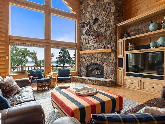 Beautiful log home on 194’ of crystal clear Elk Lake waterfront with over 2 acres! With direct access to Torch Lake for day trips to the sand bar, this location offers endless summer days of boating, fishing, kayaking, and more. Upon entering, the main living area has floor to ceiling windows that fill the space with natural light and offer breathtaking water views. The living room boasts vaulted ceilings and a split stone wood burning fireplace and is open to the kitchen and dining area. Granite counter tops, plenty of custom cabinetry, large center island, dual ovens, and bar seating make entertaining easy in the kitchen that’s fit for a chef. On those crisp mornings you can enjoy your coffee in the three seasons room, with access to the expansive deck for alfresco dining and evening cocktails. The master suite is a haven for relaxation with jetted soaker tub, tile shower, dual sinks, and large custom walk in closet. An office, half bath, laundry room, and large mud room with built-ins round out the main level. Upstairs you’ll find a quiet sitting area to curl up and read a book, three bedrooms and two full baths, and a large storage area that could be finished for additional living space. The walkout lower level is the perfect space to entertain with a large family room, game room, wet bar, workout room, and additional ensuite. A spacious yard allows for family games of flag football, soccer, and bocce ball; and has an Invisible Fence to let your pets run free. In addition to the attached garage, there is an additional garage large enough to house your boat, jet skis, even a motorcoach! You are a short drive to Elk Rapids for amazing dinners and shopping, and 15 minutes from Traverse City. Don’t miss your chance to enjoy summers on the lake while being close to some of the best quaint towns in northern Michigan!