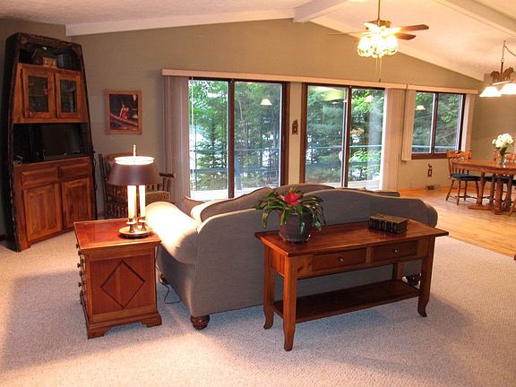 Round Lake--Fully furnished 4 BR/2 Ba cabin with ideal elevation to the sandy shoreline on Leder Bay! Enjoy the private, wooded setting on 0.55 acres and 100 feet of swimmable shoreline. With many updates, including furnace and water heater (2013) new roof (2016), some new flooring, and updated kitchen, the open concept cabin is move-in ready. Main level master. Gorgeous views from the composite deck & screen porch. Finished basement includes a built-in wet bar. Attached insulated 2+ car garage.
