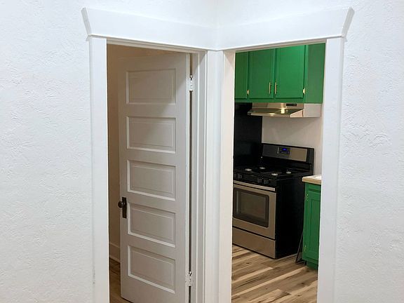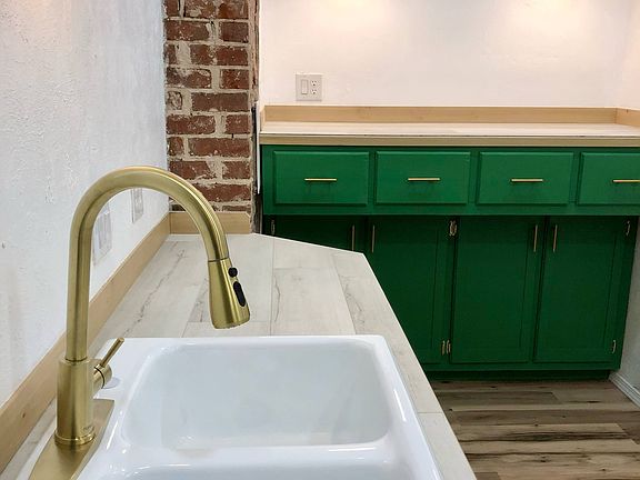 A newly remodeled 1 bedroom 1 bathroom apartment. It has unique details such as custom kitchen cabinets, a decorative beam, exposed brick, along with a custom-built vanity in the bathroom, oak floors, and extra tall ceilings.