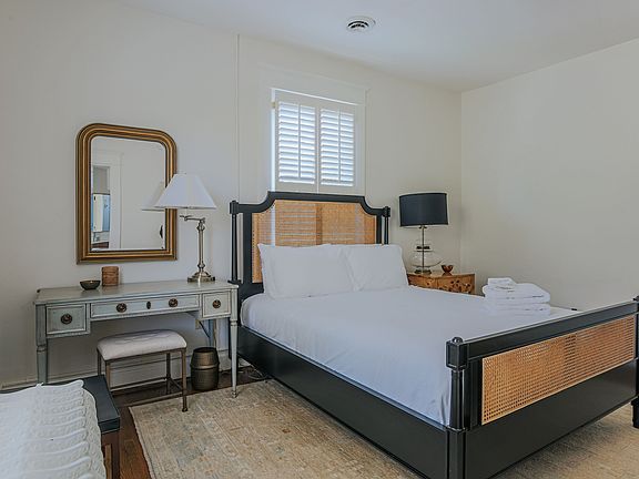 BEDROOM 2 - queen bed, nightstand with lamp, vanity, dresser