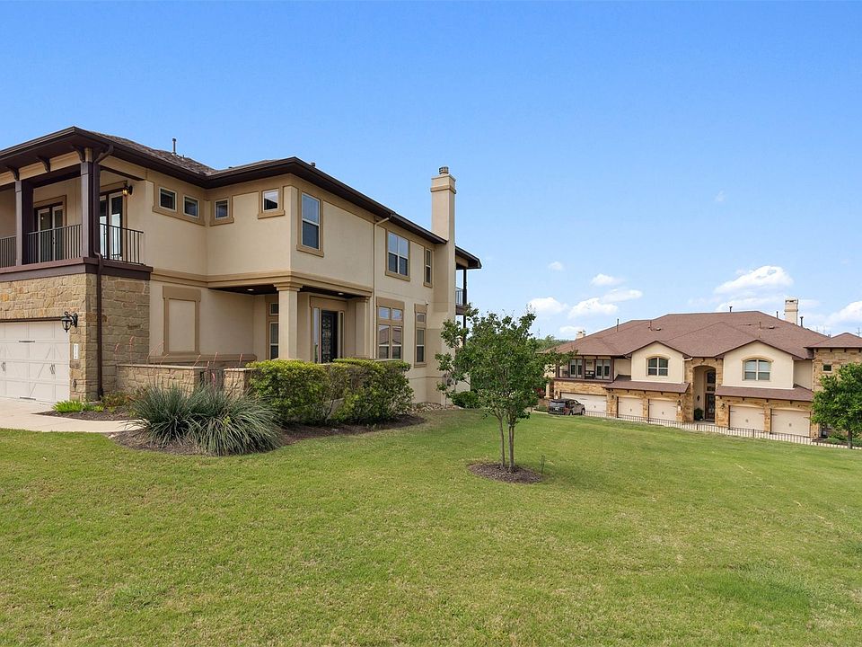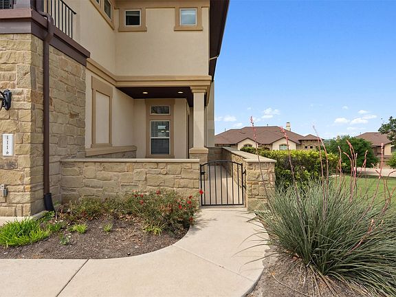 Tucked quietly at the edge of a private community, this elevated end-unit condo stands out. Light pours in from every direction, bouncing off freshly painted walls and creating an atmosphere that feels calm, open, and spacious. Just past the entry courtyard, the main level unfolds in a series of connected spaces designed for both everyday ease and wonderful memories—formal dining, a breakfast nook and a living room centered around a fireplace. The kitchen pulls everything together with granite counters, dark wood cabinets, a stone-accented center island, and stainless appliances. Dimmer switches over the dining areas let you dial in the mood, whether it’s late-night snacks or slow weekend mornings. Three separate outdoor areas extend this home even further: a patio just off the kitchen for breezy lunches, a covered balcony off the game room that feels like a bonus room with fresh air, and a private perch off the primary bedroom made for slow sunsets. On clear days, you can catch a glimpse of Lake Travis shimmering in the distance—a perk of being situated higher than most of the neighborhood. Upstairs, the primary suite is oversized, with a full bath that includes separate vanities, a soaking tub, a separate shower, and a walk-in closet. Two guest rooms, a full bath, and a game room with wet bar round out the floor, each space flowing naturally into the next. This isn't just another unit in another complex. It's a rare combination of elevated views, thoughtful updates, and a layout that lives like a house—but without the maintenance. Community perks include a pool and workout room, but the real draw is the peace, the privacy, and the kind of quiet you don't find often. The original owners have kept it in excellent shape, but it’s ready for whatever’s next.