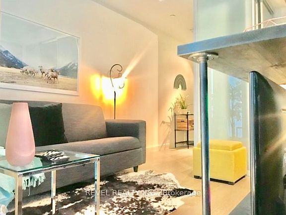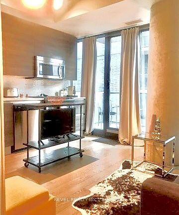 Fantastic bright 1 bed, 1 bath unit with balcony views of the CN Tower and Toronto skyline. Stylish open-concept design featuring stainless steel appliances, gas range, and built-in microwave. 9 ft exposed concrete ceilings and hardwood floors throughout add modern character. The bedroom is separated from the living area with sliding glass doors and includes a built-in closet. Live in one of the most sought-after buildings in King West! Includes locker, washer/dryer, and low maintenance fees.
