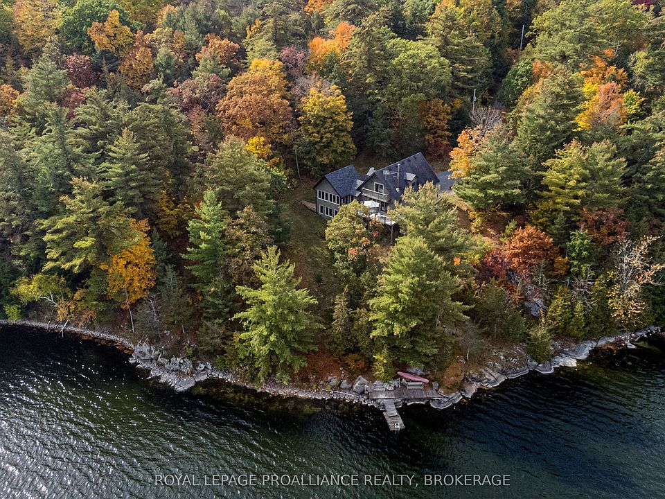 The ULTIMATE in country living for peace and tranquility. Get away from the stress of city life and relax. No need for a separate vacation property this one has everything you want AND its only 30 minutes to downtown Kingston. Enjoy 40 acres of mature woodland with walking trails and wildlife habitat. At night, marvel at the stars in a sky free from light pollution. A gurgling stream and 70 ft waterfall overlook granite cliffs and South Lake. With 2,000 ft of deep waterfront and a dock, you can swim, canoe, fish, or simply unwind. Perennial and vegetable gardens offer near self-sufficiency, surrounded by privacy and a well-equipped home. A large garage and multiple sheds provide ample storage. Inside, the open-concept home features 3 bedrooms, 2.5 baths, and flexible living space. The kitchen boasts elegant cabinetry, stainless steel appliances, and generous counters. Living and dining areas flow to a deck with lake views, islands, and passing boats. A new wood stove adds winter warmth. The family room and 3-piece bath convert into a guest suite. Upstairs, two bright bedrooms include lake views and built-ins. The 4-piece bath offers a corner tub and heated floors. A newly added lower level serves as a rec room or bedroom with walk-in closets and a separate exit. Outside, enjoy a detached garage, storage and machinery sheds, gardens, and an outdoor shower. Bonus: a 10KW solar panel system generates approx. $9,500/year in revenue until 2030.