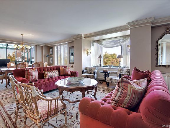 Exquisite Wyndham Penthouse with Breathtaking Pond and Golf Course Views. This beautifully renovated duplex offers 3 bedrooms, 2.5 bathrooms, and 3,200 sq ft of refined interior living between the 6th and 7th floors. It has panoramic northwest-facing views from every window and the terrace, which offers an additional 1000 sq ft of landscaped outdoor living complete with storage. Enter through a grand foyer with wet bar, powder room, closets, and a graceful staircase. The spacious living room with fireplace flows into the dining area, featuring elegant millwork and stone finishes. The oversized eat-in "country kitchen" features Thermador and Subzero appliances, marble countertops, an island, and pantry. A sunroom and family room with rich mahogany built-ins complete the first level. Upstairs, the primary suite includes two walk-in closets, a dry bar with beverage fridge, a decorative fireplace, and a spa-like bath with soaking tub, walk-in shower, and double sinks. Two additional spacious bedrooms, a full bath, and laundry room provide added comfort. Two parking spaces and secured storage are included. The Wyndham offers 12+ acres of resort-style living with a doorman, 24-hour concierge, valet, clubhouse, indoor pool, gym, sauna, walking paths, and BBQ area. FURNISHED or UNFURNISHED. Convenient to the LIRR, library, and shops and dining along 7th Street and Franklin Avenue. Mint Condition!!