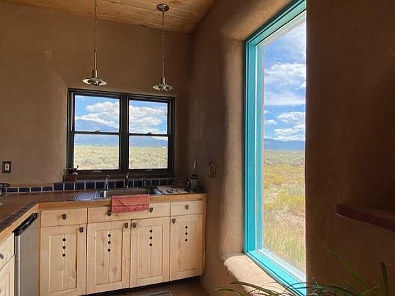 This energy-efficient strawbale house boasts sustainable features like solar panels and a cistern, making it an ideal choice for environmentally conscious buyers. The primary aspects of the house are that it is in accord with environmental principles, is located in a stunningly scenic environment, it has a beautiful totally hand-crafted interior, and it promotes and supports a simple lifestyle. The house also has electricity, and you can easily switch on the electricity if you want. Nestled in a picturesque location in Taos, with lots of privacy, the property offers breathtaking mountain views, 360-degree sunsets, and is conveniently close to Taos, Taos Ski Valley, and the Río Grande del Norte National Monument. The unique construction includes adobe straw plastered mud walls and a cozy woodstove, adding charm and a rustic touch to the home. The well-maintained driveway and concrete floors enhance the practicality and comfort of the living space. The driveway to the house has easy access to the highway and is well maintained and has a great surface to drive easily in and out of the property. The open concept design and cozy living room with a woodstove create a welcoming atmosphere, perfect for comfortable living. The house has been meticulously maintained by one owner, ensuring its excellent condition. Imagine waking up to stunning mountain views and enjoying cozy winter nights by the woodstove in this beautiful and sustainable home. Come see this absolutely enchanting off the grid property and imagine the possibilities of being the next owner of this unique and special house. This is a great house for a minimalist! There also is wood for the wood stove included!