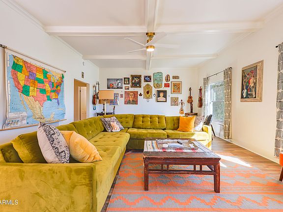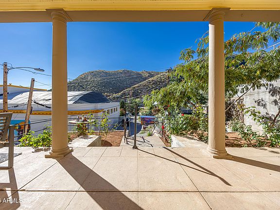 Overlooking the heart of Old Bisbee, this well-crafted 1916 home blends historic charm, modern systems, and panoramic views. 2BR/1BA + detached carriage house flex space w/ wood-beamed ceiling and original doors. Pella double-hung windows, fresh paint, engineered hardwood floors, LVP bath floor (2025), on-demand NG water heater, 200A panel (2025), HVAC (2016), roof coating (2025). Elevated front porch w/ four grand columns and koi pond overlooks Old Bisbee's entertainment district. Backyard w/ spa. Rain catchment, French drain, water filtration. Walk to food, music, coffee. W/D + appliances convey.