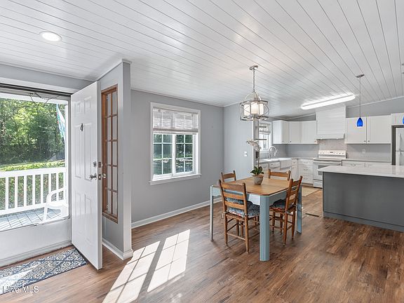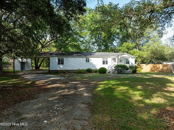This adorable 3 bedroom, 2 bath home sits on a charming .48-acre lot lined with beautiful, majestic live oak trees. The interior has been recently updated and is being sold furnished, making this amazing home MOVE- IN READY! Enjoy a modern kitchen featuring a spacious island and floating shelves that seamlessly opens up to the living room. The generous primary bedroom offers ample closet space with a beautifully remodeled en-suite bathroom, creating a comfortable and stylish retreat. Shiplap accents throughout the home add warmth and charm, enhancing the coastal feel. The circular driveway in the front welcomes you, and a brand-new back deck provides the perfect spot for outdoor living and entertaining. Just imagine...oyster roasts, cookouts, family gatherings, and evenings under the stars in your own private backyard! A carport and storage shed are included offering plenty of space for tools, outdoor gear, or boating accessories. Located on a private street with no active HOA, conveniently close to Kiwanis Park, Topsail Beach and the public boat ramp, this property is ideal for outdoor, boater, and fishing enthusiasts alike. Spend your days on the coastal waters and return home to your own peaceful retreat! Welcome HOME!