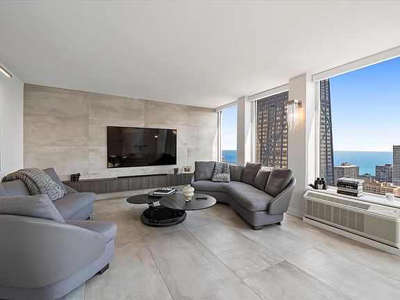 High-end renovation with nothing overlooked! Experience breathtaking east, south, and west views of Lake Michigan and Chicago's iconic skyline from every room in this stunning, high-floor 2 bed/2 bath corner residence. With 23 floor-to-ceiling windows and custom remote-control blinds, natural light pours in from three exposures, highlighting the sleek, modern design of this 1,600 sq. ft. home. The open-concept living, dining, and kitchen areas maximize both lake and city views. The chef's kitchen features integrated custom cabinetry, top-tier Miele appliances, a large island, and designer lighting. A thoughtfully designed circular floor plan allows light to flow seamlessly throughout the space. The primary suite boasts a walk-in closet and a luxurious spa-like bath with a walk-in steam shower-plus the perfect bedroom orientation to take in spectacular sunsets. The second bedroom has been reimagined as a flexible lounge/den/office with custom storage and its own walk-in closet. An upgraded guest bath with bespoke tile and lighting, along with in-unit laundry, complete this one-of-a-kind home. Located in a full-amenity, pet-friendly building, residents enjoy 24-hour door staff, an outdoor pool, multiple rooftop patios with grills and seating, a banquet/party room, fitness center, conference room, same-floor storage, and even on-site dry cleaning. All of this in the heart of the Gold Coast, just steps from premier shopping, dining, the lakefront, and everything Chicago has to offer. Luxury. Location. Style. Views. Love where you live!