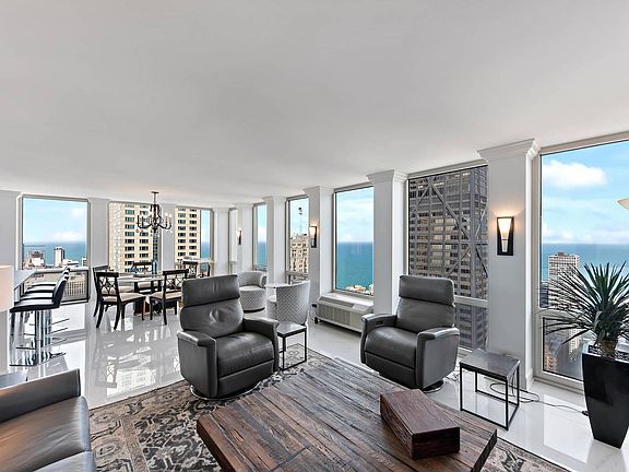 Experience elevated living in this newly renovated, fully furnished 2-bedroom, 2-bathroom condo, perched on the 53rd floor of a prestigious Gold Coast building. Spanning 1,600 square feet, this unit offers an array of designer finishes and classic decor, making it the perfect turnkey solution for short-term stays. Enjoy breathtaking, unobstructed panoramas from 23 floor-to-ceiling windows. Views stretch across Lake Shore, Navy Pier, and the city's beaches, capturing stunning sunrises, vibrant fireworks, and serene sunsets. The nighttime skyline of Chicago's skyscrapers provides a dazzling backdrop to your living space. This home includes access to first-rate amenities: a heated outdoor pool, a modern fitness center, on-site dry cleaning, a conference room, BBQ decks, and a party room equipped with a kitchen and bar. Extra-large storage is conveniently located on the same floor as the unit. Heated garage parking can be negotiated into your lease, adding comfort and convenience. Located at the heart of the Gold Coast, between Michigan Avenue and Rush Street, the building has dual entrances from Chestnut or Pearson Streets. Whether you're in Chicago for business or leisure, this home offers the ultimate in luxury, location, and convenience, making every short stay memorable.