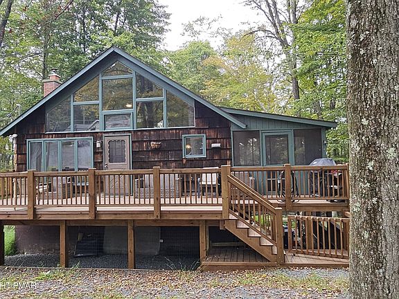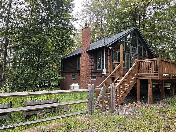 If Rustic Charm is what you are looking for - search no further! This unique mountain chalet features wood beamed ceilings, kitchen island with slate insert, spacious loft, 3 pellet stoves, and screened in porch. Plenty of natural light will brighten up your days! Upgrades include a newer roof, oversized new decking, new dishwasher, large ceiling fan, and both showers have new glass doors. Plenty of living space with a large loft bedroom, 2 bedrooms on the main floor. Large primary bedroom on the lower level also has a pellet stove for those cold winter nights! Lower level also has a utility room, a room with a pellet stove and walk out access to patio area, and yet another room providing plenty of additional space!! With seasonal lake views, walking distance to Locust Lake and access to the community center and ski hill right across the street, this mountain retreat will not disappoint! Fenced in yard is a plus, and large storage shed provides enough space to house your golf cart or ATV, which are allowed in the community! Close to all popular Pocono attractions including Jack Frost/Big Boulder Ski Resort, Camelback Ski Resort, Kalahari Water Park, Mount Airy Casino, to name just a few! Furniture, televisions and Golf Cart are INCLUDED!! Whether you're searching for your own mountain getaway or an investment property, don't let this one pass you by! Locust Lake Village is a short term friendly community. This is a full time residence - NO RENTAL HISTORY available. Schedule your showing today!