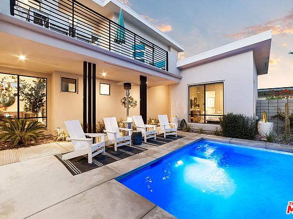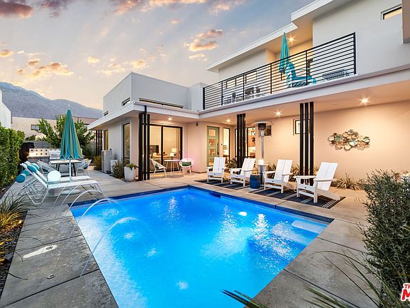 We are excited to introduce 111 Holliday Way, a stunning home in the recently completed Vue development in central Palm Springs. This former model home and end unit boasts one of the largest lot in the development and is ideally located within a pedestrian-friendly distance of downtown Palm Springs. This unique residence features three bedrooms, three and a half bathrooms, and a detached casita, perfect for guest privacy. It comes equipped with owned solar, a pool and spa, a built-in outdoor cooking area, and a two-car attached garage. Inside, you'll find numerous upgrades and thoughtful design elements. The dining area is highlighted by a modern chandelier and impressive 20-foot ceilings. The open-concept kitchen serves as a central gathering space, seamlessly connecting to the living area with a fireplace on one side and the dining area, which leads to an upstairs Library Loft, Private Bedroom and expansive Deck. All bedrooms are en-suite, providing comfort and convenience. The home includes multiple outdoor seating areas offering views both east and west from multiple levels and truly special views of Mt. San Jacinto. The home is located within a gated community and offers the new owner an abundance of privacy. Some furnishings are available outside of escrow, and a detailed list of upgrades is attached to the listing.