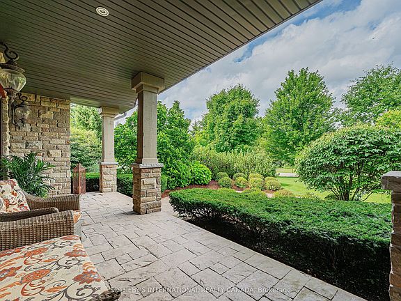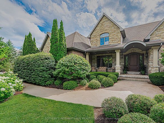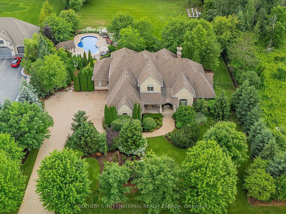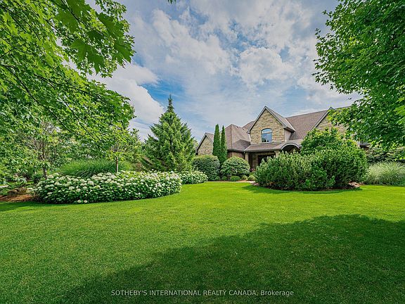 Welcome to 111 John Bricker Road. Located in Cambridge's most sought after luxury neighbourhood- within the historic Village of Blair. Enjoy a tranquil park-like setting-situated on 1.42 acres, over one acre of wrought iron fully fenced lawn, surrounded on two sides by The Blair Conservation Area and Environmental Area. Outdoor living immersed in nature and exceptional landscaping- from salt water pool to pond and rock waterfall, welcome to your new oasis. 111 John Bricker exudes care and elegance throughout. French Chateau countryside inspired, with a total living space of 7,889 SF, enjoy this custom masterpiece- cathedral ceilings, exquisite details, marble tiles, natural stone, a mahogany front door and much more. Boasting a custom Ascona chef's kitchen equipped with high end built-in appliances, an oversized island and granite counters with an open concept view of the breakfast area and great room with an 8 foot fireplace. The main level primary bedroom includes a gas fireplace, a walk-out to a private deck, a luxurious ensuite complete with double sinks, a soaker tub and a separate glass-enclosed shower and spacious walk-in closet. Two additional generously sized bedrooms on the upper level, each with a walk-in closet and a shared ensuite. The lower level features a fully finished recreation room, exercise area, games area, a fourth bedroom, three piece bathroom and ample storage space. The outdoor living boasts plenty of seating and space for cooking around a unique stone wood burning fireplace constructed with over 50,000 lbs of Ontario quarry stone. Also enjoy- a heated pool surrounded by innovative Safescapes non slip outdoor surface. 111 John Bricker is everything imaginable- from the soaring ceilings to prestigious landscaping and every intricate detail in between this home is truly spectacular. Located minutes from 5-Diamond dining at Langdon Hall, major highways, scenic Grand River trails, and a short drive to schools and local amenities.