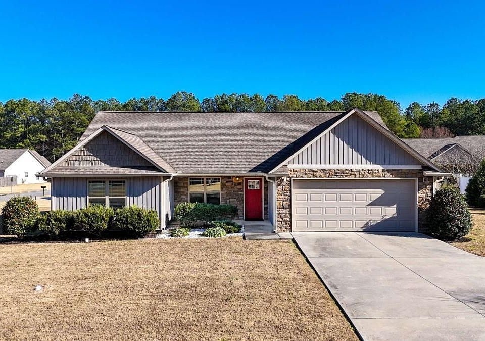 Welcome home to this charming Craftsman-style 3 bedroom, 2 bathroom ranch, perfectly situated on a beautifully landscaped corner lot near a quiet cul-de-sac. With its easy-maintenance exterior, covered front and back patios, and inviting curb appeal, this home offers both style and convenience. Step inside to find fresh paint, luxury vinyl flooring, and recessed lighting flowing seamlessly throughout. The welcoming foyer opens into a bright open-concept living room, kitchen, and dining area, showcasing abundant natural light and a stunning large tray ceiling for added architectural character. The kitchen features white cabinetry, stainless steel appliances, and a functional layout perfect for both everyday living and entertaining. The spacious primary suite includes a walk-in closet, double-sink vanity, soaking tub, and a separate shower, creating a comfortable retreat. Two additional bedrooms and a second full bath provide ample space for family, guests, or a home office. This well-maintained home blends modern finishes with Craftsman charm-move-in ready and designed for easy living.