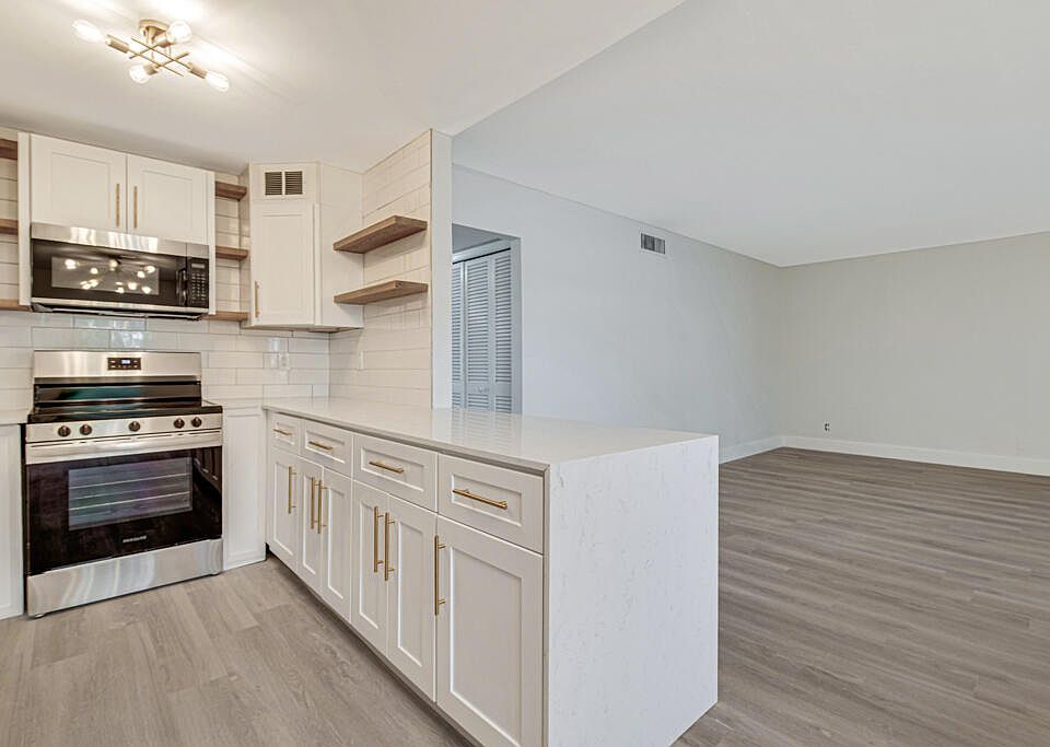 Contemporary subway tile backsplashModern amenitiesQuartz countertopsCozy livingNatural lightSleek white cabinetryNew stainless steel appliances