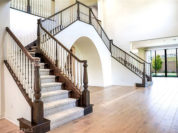 Situated within the prestigious guard-gated enclave of The Grove at Orchard Hills, this Cielo residence by Toll Brothers offers the perfect blend of timeless sophistication and contemporary California living. Ideally positioned on a desirable corner lot along one of the community’s most tranquil and sought-after streets, this stunning home captures both privacy and elegance. A charming semi-enclosed front porch welcomes you before entering through the grand double doors into a sun-filled, open-concept interior. Designed for seamless indoor-outdoor living, the residence showcases five spacious ensuite bedrooms—including a convenient main-level suite—alongside five and one-half bathrooms and an expansive upstairs bonus lounge, creating an ideal layout for multi-generational living. The impressive foyer, framed by a sweeping staircase and versatile flex room, opens to beautifully connected formal and casual spaces. The gourmet chef’s kitchen is appointed with Wolf and Sub-Zero appliances, an oversized island, flowing effortlessly into the dining area, family room with fireplace, and great room that transitions seamlessly to the outdoor entertaining space. The home’s unique corner location and desirable floor plan highlight an expansive courtyard and backyard, set on an impressive 11,420 square foot lot. Designed for both leisure and play, the outdoor retreat features a bike and scooter path, sandpit, garden bed, and a large artificial turf area, offering a dream environment for children while adults enjoy breathtaking sunset views over the avocado groves. A spacious three-car tandem garage provides ample room for large vehicles, SUVs, or even RVs, complementing the home’s thoughtful functionality and style. Experiencing the very best of Orchard Hills living—where refined luxury, family comfort, and resort-inspired amenities come together in wonderful harmony.