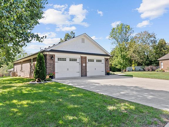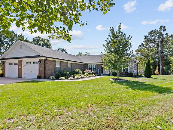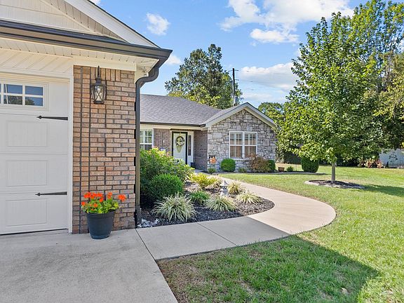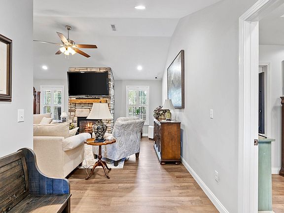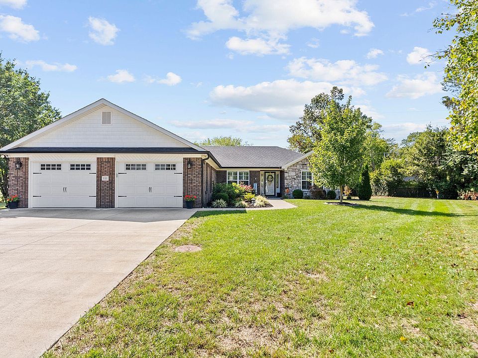 Charming Ranch with Modern Upgrades and Inviting Outdoor Space, Step into this beautifully designed brick and stone ranch-style home, where comfort meets style in an open floor plan layout. LVP flooring runs throughout the entire home, combining durability with sophisticated appeal. Right off the entrance is a home office with French doors. The spacious kitchen is a true highlight, featuring abundant cabinet space, a sleek ceramic tile backsplash, and elegant marble countertops. Stainless steel appliances and a generous pantry make meal prep and storage a breeze. Enjoy the privacy of a split-bedroom layout, perfect for families or guests. The primary suite offers a peaceful retreat with an oversized walk-in closet and a beautifully designed en-suite bathroom, complete with a luxurious walk-in shower that adds a touch of spa-like comfort. The additional bedrooms are thoughtfully separated, offering both functionality and privacy for everyone in the household. The home is equipped with a 50-gallon natural gas water heater for energy-efficient hot water on demand. Relax in the cozy family room by the stunning stone gas fireplace—an ideal spot for quiet evenings or entertaining guests. A mounted 65-inch TV conveys with the property, making movie nights even better. Throughout the home, you'll find stylish shutter blinds that add both beauty and functionality. Step outside to your private backyard oasis featuring both covered and uncovered 10' x 16' patios—perfect for outdoor dining or relaxing in any weather. Beautiful landscaping surrounds the home, highlighted by a vibrant 90-foot flower garden that brings year-round color and charm. Security is a priority, and this home includes a system that will stay with the property for your peace of mind. Don't miss this move-in ready gem that blends luxury finishes, practical features, and stunning outdoor spaces—schedule your private showing today!