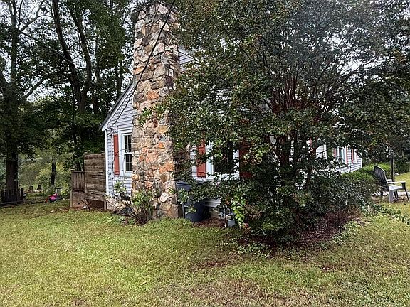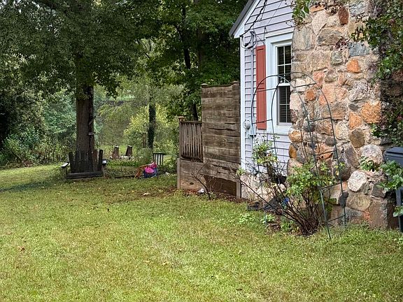 The exterior boasts beautiful stone work that adds significant character. Practical updates include a newer tin roof and vinyl windows. Additional features include a detached storage/garage in the backyard, a concrete parking pad out front, and beautiful established landscaping.