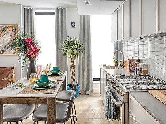 Perfectly positioned at the crossroads of Prospect Park and the Brooklyn Botanic Garden, 111 Montgomery offers an unparalleled living experience with amenities never before seen in Crown Heights. Residents enjoy a sunlit co-working lounge, community garden, BBQ and terrace dining area, fully equipped fitness center with Peloton bikes, an inventive wilderness-themed children’s playroom featuring Montessori climbing ladders, and a spectacular landscaped roof terrace with Brooklyn and Manhattan skyline views.