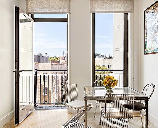 Upon entry, you're welcomed into a bright and airy space with impressive ceiling heights, oversized north-facing windows adorned with custom shades from The Shade Store, and wide-plank white oak flooring that adds warmth and elegance throughout. The open-concept living and dining area is anchored by a Juliet balcony, inviting in fresh air and natural light while creating an ideal setting for relaxing or entertaining.