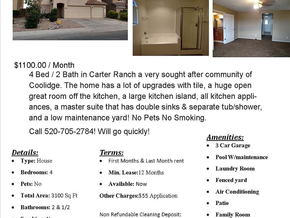 4 Bed / 2 Bath in Carter Ranch a very sought after community of Coolidge. The home has a lot of upgrades with tile, a huge open great room off the kitchen, a large kitchen island, all kitchen appliances, a master suite that has double sinks & separate tub/shower, and a low maintenance yard! No Pets No Smoking. Call 520-705-2784! Will go quickly!
