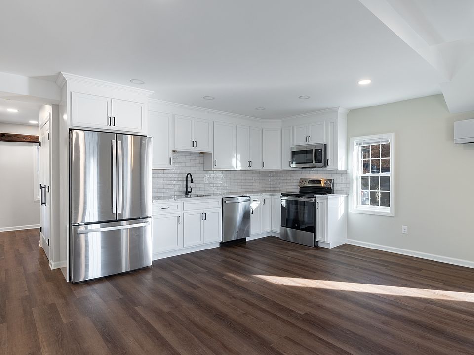 Enter your home through the covered porch to find an open and spacious kitchen with quartz counters, tile backsplash, and SS appliances including dishwasher. This is an open layout to the living room and dining nook featuring exposed original wood bringing character into the space.