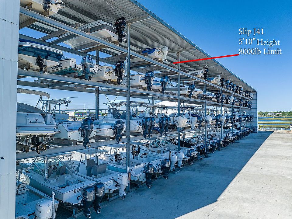 The slip is on the top row of the 35 foot building - 35 feet long , 9'6" wide and 5'10" high with a weight limit of 8000lbs. Most skiffs and center/dual console boats without T Tops will fit in this slip subject to club manager approval. Work racks are available on site for boat service/cleaning by you or an approved vendor.