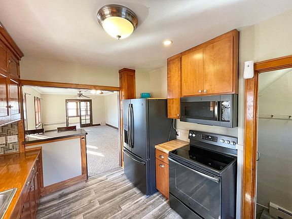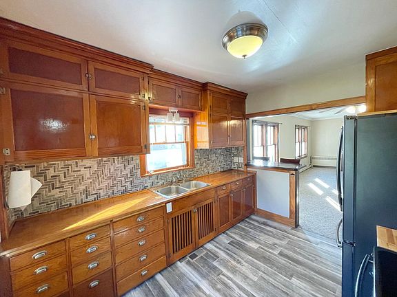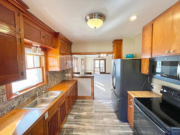 Located on a corner lot, this very well-maintained brick home features 3 bedrooms, 2 bathrooms, a spacious living room which leads to the office/sunroom with lots of natural light and French doors, an eat-in kitchen with updated appliances, a full basement with potential for additional finished square footage, and updated shingles, forced air furnace, and central A/C. Two of the bedrooms are located on the main level (and have hardwood floors) and the third bedroom is on the upper level, which is completely wide open and has ample storage space. Right out the back door is a new patio space and sidewalk leading out to the detached double garage. The garage is heated, very clean, has walk-up storage and a built-in work bench - great options out there for lounging and/or storage! MUST SEE!