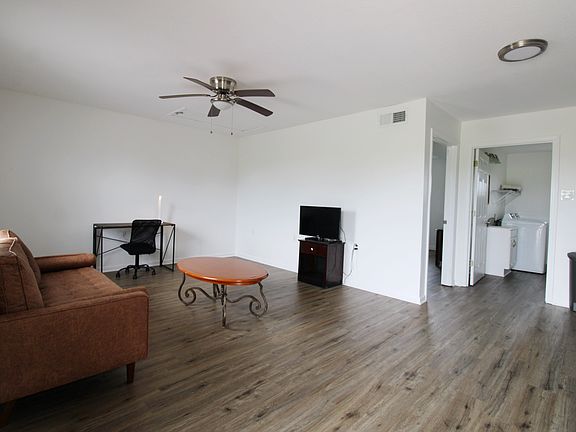 *Living Room with Couch, TV, Coffee Table, Desk + Chair, and Ceiling Fan