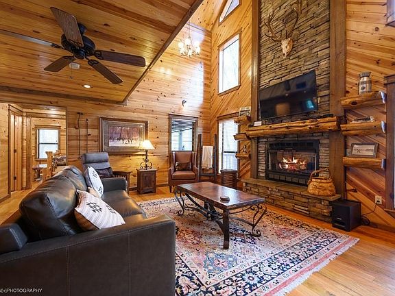 Sundance, a true cabin in the forest, is tucked away in the towering pine trees with only great entertaining space and forest behind. This beautiful authentic cabin is located in the Lakewood Estates subdivision which is directly across from one of only 2 lake access roads, Carson Creek. Only a few minutes to all area attractions and restaurants, Sundance provides everything you need for in a family getaway cabin experience. The wrap around decking and private hot tub space allows room to gather and relax. The beautiful gas log fireplace is the focal point of the living area. in the kitchen you will find everything needed to cook a gourmet meal and the dining area is spacious enough for all staying in the cabin. Two bedrooms downstairs, one is a very large master with a door accessing the deck outdoors and a master bath. Additional bedroom and game room space upstairs for ease of privacy and separate entertainment. The large circle drive in front of the cabin allows for plenty of parking, including boats space. Let's get this one on schedule for a showing! Priced to move!
