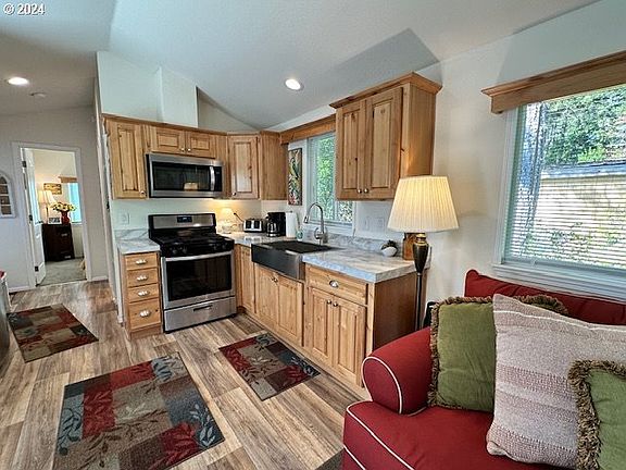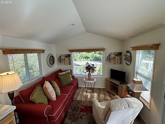 Adorable, 2023 built, 400 sq ft park model home with 1 bedroom, 1 bathroom plus a bunk house at 200 sq ft with 1 bedroom and bathroom as well. The park model is light and bright with vaulted ceilings and lighting in the ceilings. The home has laminate plank flooring and carpet in the bedroom. It is cute as a button. The bunk house has a partial kitchen and a full bathroom with room to relax. All the custom decking brings the two structures together as well as the two sheds giving ample storage room and plenty of room for entertaining. There is no neighbors on 2 sides making this property unique and it brings in ample sunlight. This home is right around the corner from the kids park, public laundry and the club house. The yard is fully fenced in front allowing a great space for your pets to roam safely. Plenty of parking so bring your toys and enjoy this coastal getaway or use for full time living. Being a gated community it gives a sense of security with wonderful added opportunities using the onsite laundry, outdoor pool, secured mail, workout equipment, sauna, meeting and party rooms and road maintenance. The low fee monthly dues include water, sewer and trash services. Don't miss your opportunity, come see it today!
