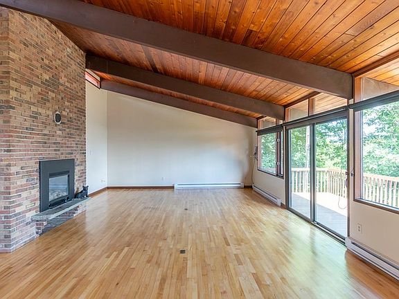 Beautiful Contemporary style deck house situated on 40 acres at one of the highest points in Chemung County. Would be a perfect spot to care for livestock on the land! Enjoy incredible views from open floor plan living room, dining area and updated kitchen. Cathedral ceilings featuring fir beams with tongue and groove cedar ceilings. Floor to ceiling brick fireplace. Mahogany trim and stairs. Spacious deck wraps around the front and side provides great space for summertime parties and family events. Downstairs features a stone fireplace and Vermont casting stove, ceramic tile floors with large