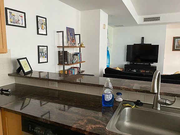The unit features an open floor plan and a generously sized living room with a hardwood floor. The kitchen features granite counters, a Mediterranean stone floor, stainless steel appliances, and a breakfast bar.
