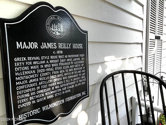 The historic plaque on the front porch displays this as the ''Major James Reilly House'' with a date of 1838, but there are parts of the house from the 1820's. Major Reilly was an Irish Emigrant who commanded the last remaining garrison forces at Fort Fisher. Reilly purchased the house in 1874 and lived in it for nine years.