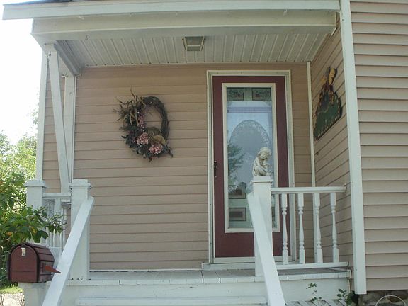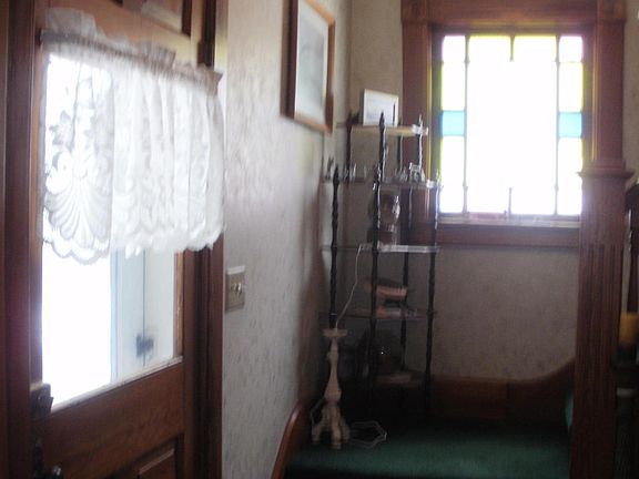 Ornate front porch to welcoming foyer(oak interior)to a front office/library w/french doors.Living room to a country sized kitchen.First floor bdrm w/1/2 bath.Charming spacious guest bathroom. Quaint little side porch into dinning room. Open Oak banister staircase brings you upstairs past a stained glass window to the cathedral stair ceiling w/ chandelier. Upstairs 3 bedrooms & modern bath.Balcony Porch in front. Beautiful Immaculately clean home! High efficiency nat gas hot water boiler.Full basement for storage. Basement Laundry can be located elsewhere in this large home. Mature trees. A deck off of the kitchen for grilling. The oversized garage has an insulated comfortable room used as an office/work shop. Overhead garage door entrance. Storage space inside plus outdoor barnstyle shed