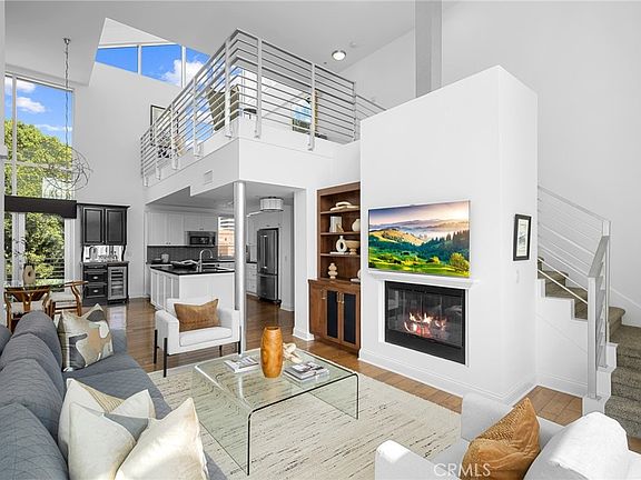Overlooking the living space is a versatile loft—perfect for a home office, yoga studio, or guest retreat. The living room boasts a cozy gas fireplace and opens to a balcony overlooking the serene courtyard.