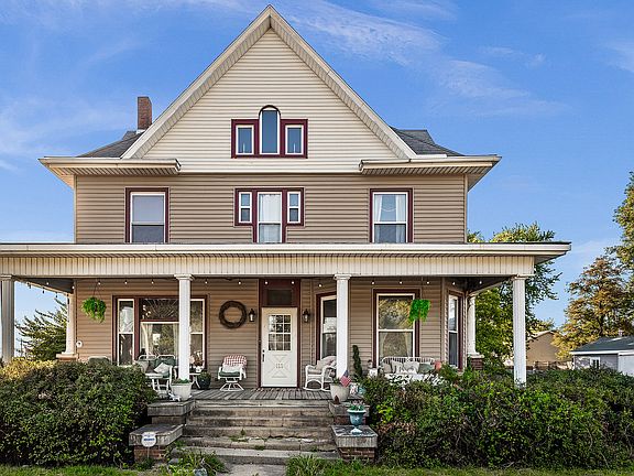 Step back in time without giving up modern comfort in this beautifully preserved and thoughtfully updated 5-bedroom, 2-bath home in the heart of Heyworth. Originally built in 1903 and later moved 13 miles from LeRoy by horses and telephone poles, this remarkable two-story treasure is a living piece of local history, lovingly maintained for over a century. From the moment you step inside, you'll feel the character and craftsmanship that define this home: 10-foot ceilings, original hardwood floors and trim, intricate radiators, transom windows, a built-in hutch, and grand wood pocket doors. A charming working laundry chute, two staircases, and even a few original light fixtures bring warmth and nostalgia throughout. The updated kitchen blends history and function with stainless steel appliances, a large island, newer cabinetry, and a walk-in pantry. French doors lead to a huge 14' x 20' covered back porch. Upstairs, the walk-through primary closet and clawfoot tub add vintage elegance, while the main-floor bath offers a touch of luxury with heated floors. Set on nearly half an acre in a quiet, friendly neighborhood, the yard is a dream, complete with apple and peach trees, mature landscaping, and even a treehouse built in 2024. Enjoy both a covered front porch for morning coffee and a rear porch for evening gatherings. The extra-deep garage provides plenty of storage and workspace. Recent updates bring peace of mind: 2020-2024: Kitchen and pantry remodels, new flooring, bathroom updates, newer appliances, fence and gates, washer, dryer and garbage disposal. 2023: New street, sidewalks, and sewer lines on Karr Street Nest thermostat with Wi-Fi controls for modern efficiency Most windows and boiler believed to have been replaced within the past decade Located just 12 miles from Bloomington, Heyworth offers small-town charm with easy access to city amenities. Home Sold As-Is. Fireplace is As-Is. A truly one-of-a-kind blend of history, character, and comfort. Schedule your private showing today and experience the charm of 111 S. Karr Street for yourself!