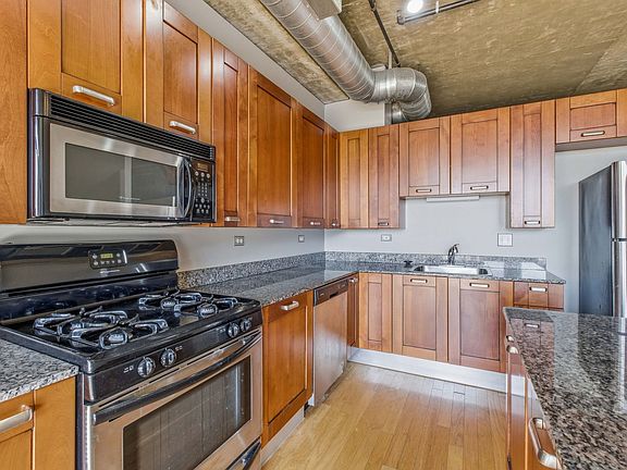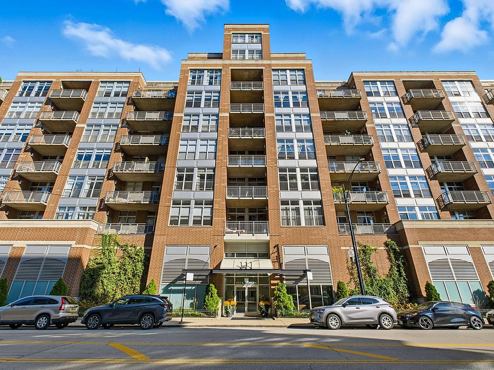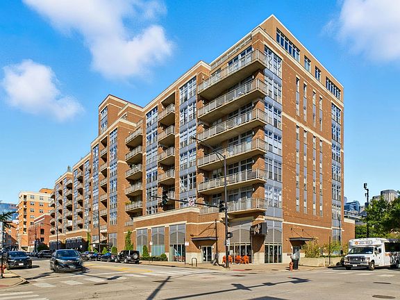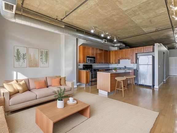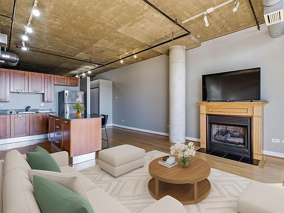 This bright, spacious concrete corner loft, is perfectly located in one of Chicago's most desirable neighborhoods. The open-concept living area features hardwood floors, a cozy fireplace, and ample space for both a dining table and island seating. The bedroom offers carpeting for added comfort, while the modern kitchen includes granite countertops, stainless steel appliances, and generous cabinet space. The bathroom offers a separate tub and shower along with a convenient linen closet, and the home provides abundant storage throughout. A west-facing balcony showcases beautiful sunsets and city views. Additional highlights include in-unit laundry, garage parking, 24-hour door staff, and elevator access. Cable and internet are included in the assessments.